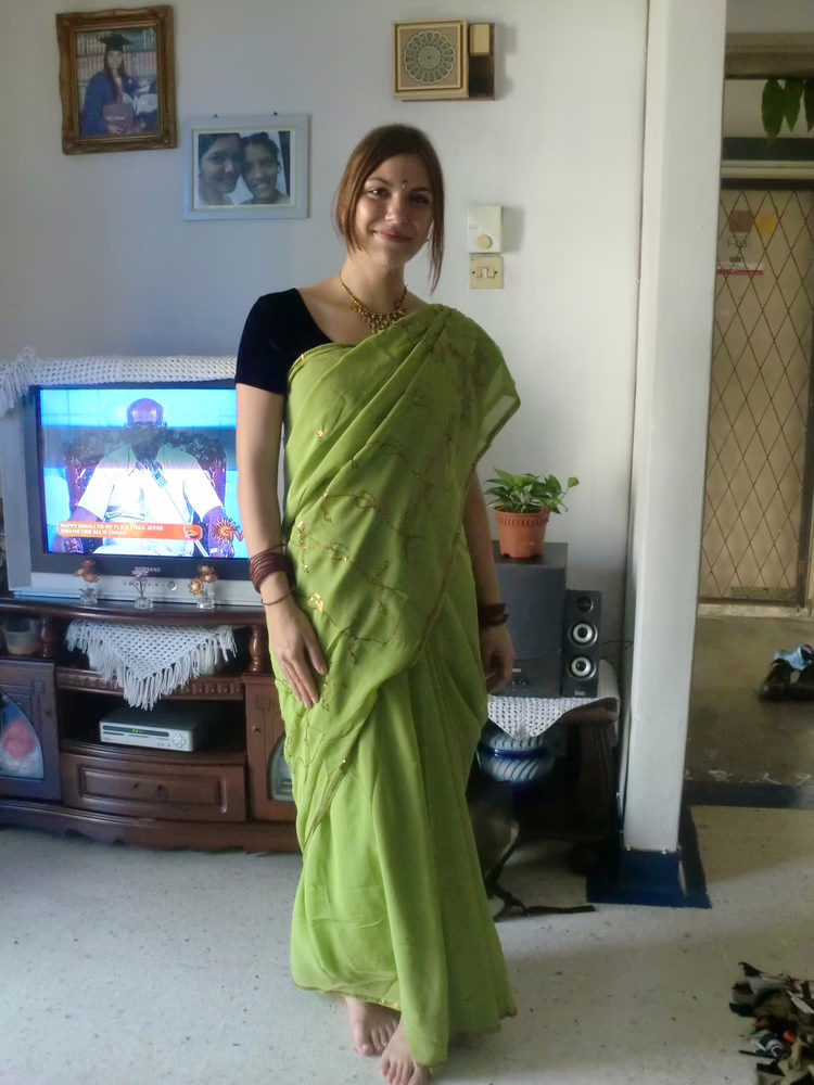 Da Mangalagiri und ihr Mann keine Kinder haben, wurde ich für einen Tag als Tochter adoptiert und in das bescheidene Heim der Familie eingeladen. Ich durfte mit ihnen speisen und wurde von den Frauen der Familie hingebungsvoll in einen traditionellen Sari gewickelt. Dann besuchten wir einen Hindu-Tempel und ich durfte an der Zeremonie teilnehmen. In dem kleinen Tempel war ich der Hingucker – wohlwollende Kommentare verglichen mich mit einer Barbie-Puppe.