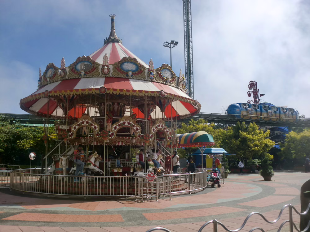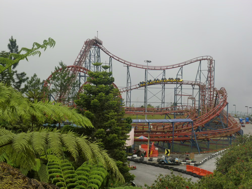 Beim Aussteigen trifft mich der Kälteschock: Die Highlands haben ihren Namen nicht von ungefähr. Sie liegen auf 1.760–1.800 m Höhe. Auf einmal hat es „nur noch“ 20 °C, es ist windig und bitterkalt. Der Freizeitpark befindet sich auf dem höchsten der dortigen Berge – und ich mich plötzlich inmitten eines Wolkenmeeres. Angie hatte versäumt, mich vorzuwarnen, sodass ich mich völlig unpassend gekleidet in Flip Flops, kurzer Hose und Trägertop dort vorfinde – während alle anderen Besucher in Kapuzenpullis eingepackt sind. Praktischerweise gibt es für fehlgeleitete Touris wie mich natürlich überall Pullis zum Freundschaftspreis zu erwerben.