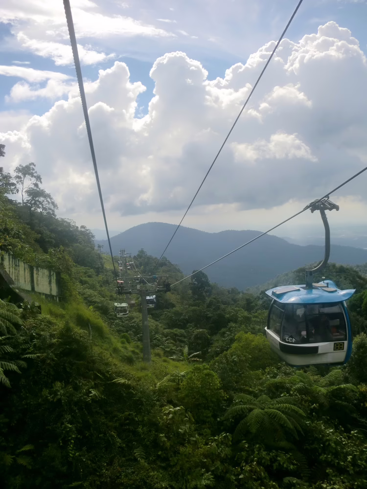 Ich verbringe einen wundervollen Tag damit, Warteschlangen für die Fahrgeschäfte im Park zu überspringen, weil immer noch genau eine Person gesucht wird, um die Plätze voll zu machen. Werde kurzzeitig von einem indischen Ehepaar adoptiert, das dieselbe Route durch den Park nimmt. Folge Schildern zu einem „Skywalk“ und lande in einer Seilbahn, die mich in 20 Minuten ins Tal bringt. Ich schwebe über dem Regenwald und lausche den Schreien der Affen und Vögel unter mir, während sich der Blick auf das Hochland, die Berge und den Nebel öffnet, der zwischen den Gipfeln hängt.