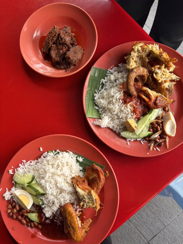 Und die Empfehlung der Dame ist ein Volltreffer: Bei Ziemel Corner Nasi Lemak Kukus ordern wir weltklasse Nasi Lemak mit Hühnchen, Beef Rendang und Sambal Squid.