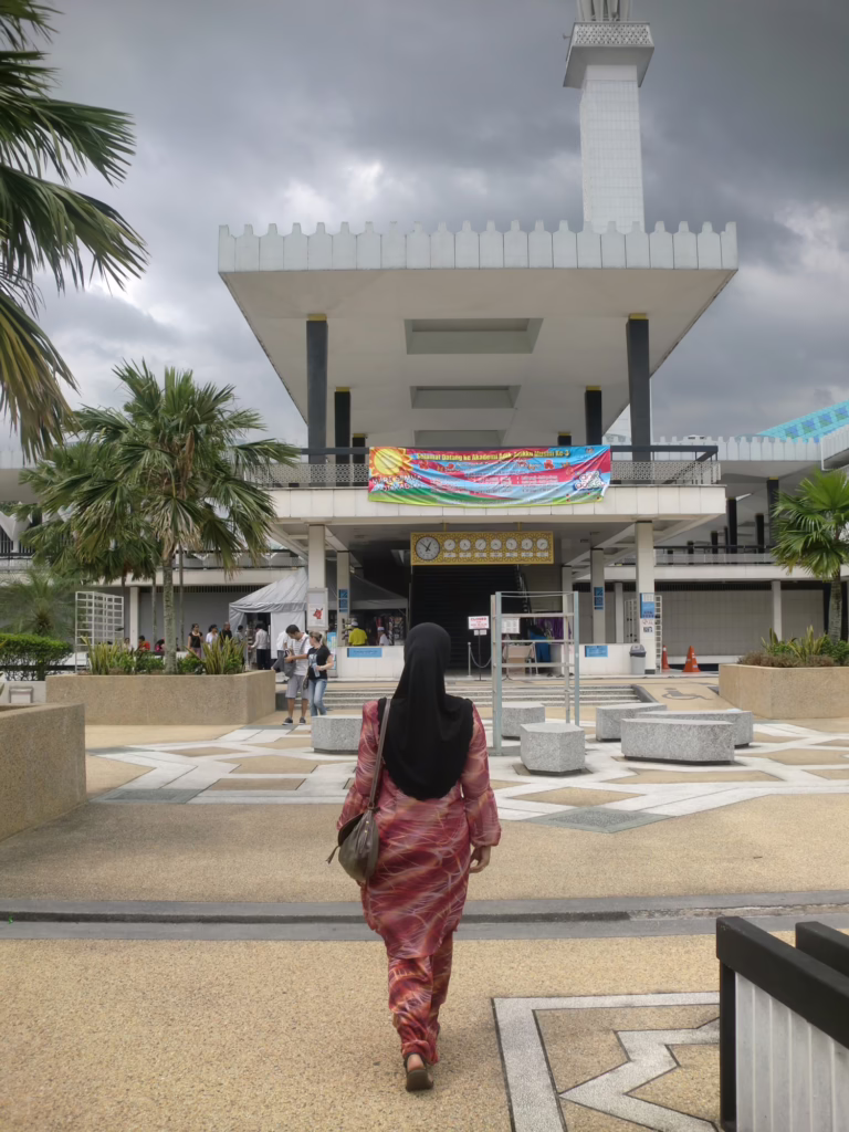 Zuvor hatten wir einen Abstecher zur National Mosque mit ihrem beeindruckenden türkisblauen Faltendach und strahlend weißen Minaretten gemacht. Während Nadila dort betete, schlüpfte ich auf der Gästetoilette in meinen baju kurung, um die Moschee nach der Gebeteszeit besichtigen zu können.