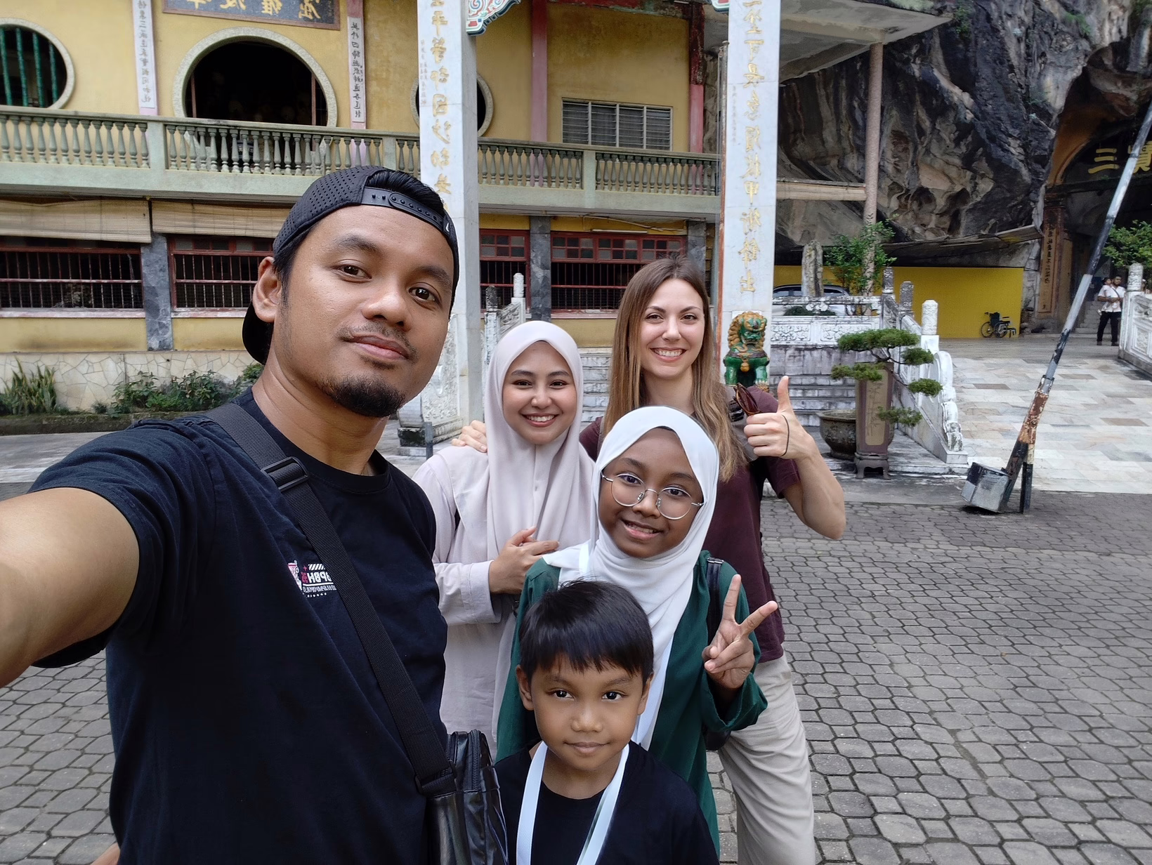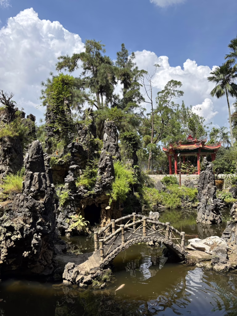 Das Highlight ist für mich der zweite Tempel, zu dem ich gelange, indem ich die Haupthöhle durchquere. Sie öffnet sich in einen von hohen Kalksteinwänden umgebenen Platz mit einem Schildkrötenteich und einem beeindruckenden chinesischen Tempelbau.