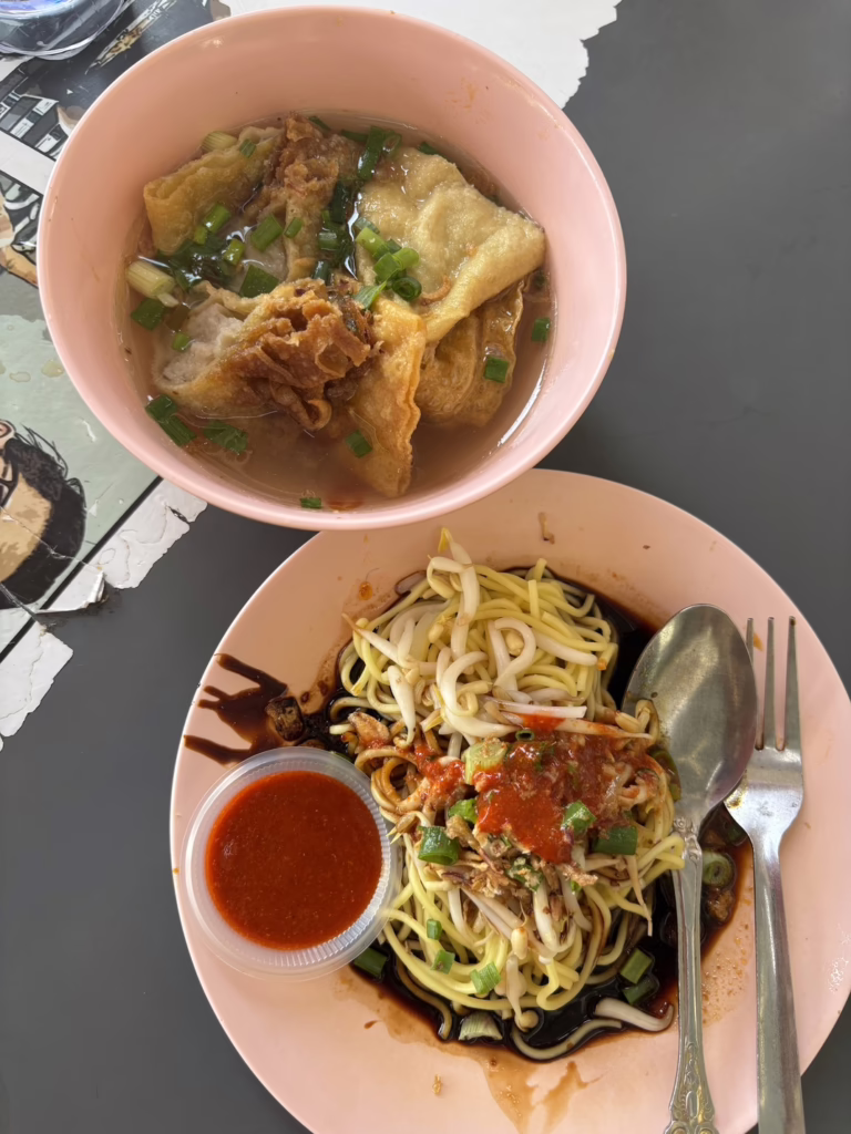 Das Festmahl beginnt mit mee kicap, einem Nudelgericht, das in Ipoh als Frühstück beliebt ist. Es besteht aus blanchierten gelben Nudeln, die mit einer süßlich-dunklen Sojasaucen-Mischung vermengt und einer klaren Suppe mit frittierten Fisch-Wonton serviert werden.