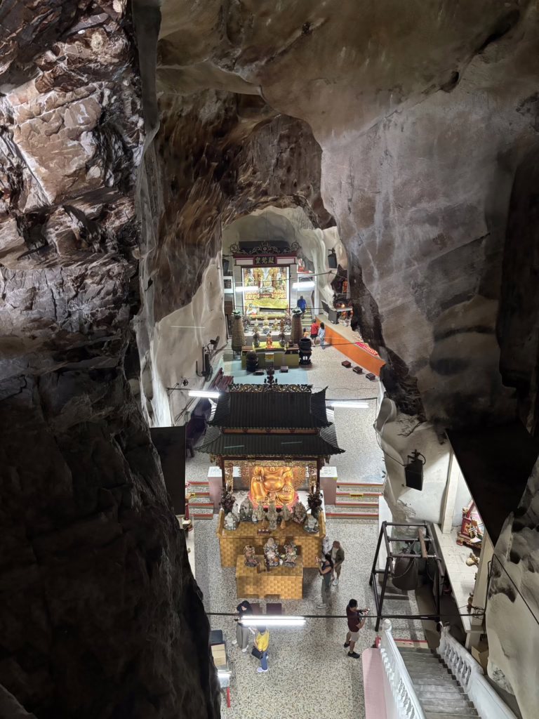 Im Inneren der kühlen, halbdunklen Höhle tummeln sich zahlreiche Buddha‑Statuen in Nischen und verschmelzen mit den beeindruckenden Felsformationen. Über 246 Stufen gelange ich zu einer höher gelegenen Öffnung, die mir trotz Gitternetz für die Affen einen weiten Blick über Ipoh ermöglicht.