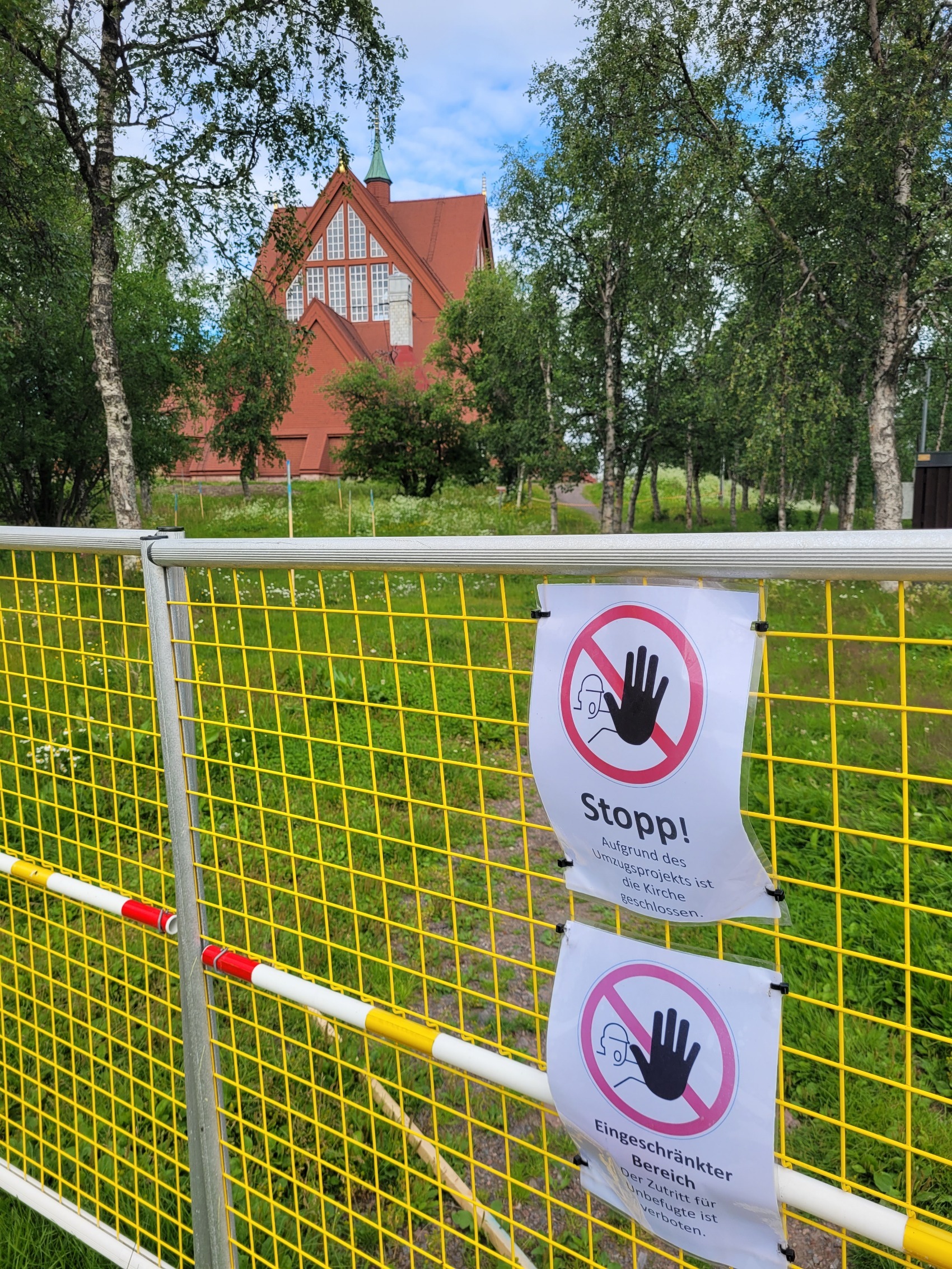 Leider ist es zur Zeit meines Aufenthalts durch die Umsiedlung unmöglich Kirunas wunderbare Holzkirche zu besichtigen. Die Kirche ist einer Sami-Hütte nachempfunden und wurde zwischen 1909 und 1912 erbaut – mit freundlicher finanzieller Unterstützung von, na wer kann es erraten? Genau, LKAB. Die Kirche wird nächstes Jahr im ganzen Stück ins neue Stadtzentrum transportiert und soll dort in 2026 bereits wieder eröffnen. Ein heikles Unterfangen!