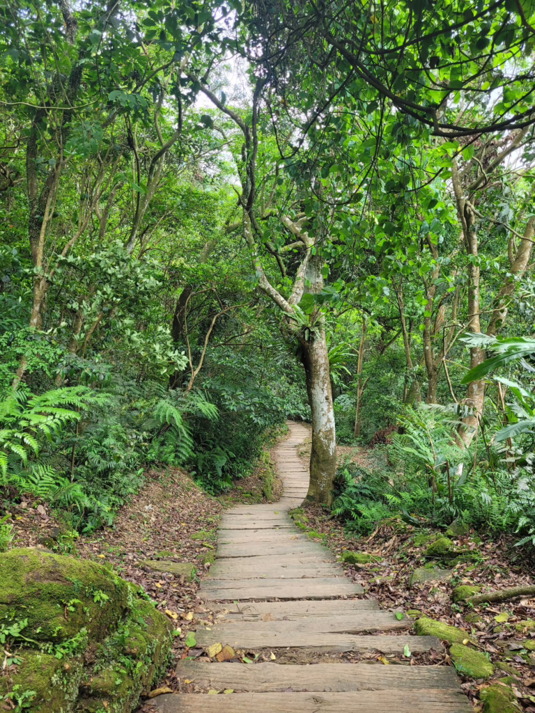 Während ich esse, setzt leichter Regen ein. Dennoch mache ich mich auf den Wanderweg hinab zum Zhinan-Tempel, der auf dem sogenannten Monkey Mountain liegt. Das Blätterdach, meine Regenjacke und der mitgebrachte Regenschirm spenden mir Schutz, während ich komplett alleine durch Taipeis bergiges Umland spaziere.
