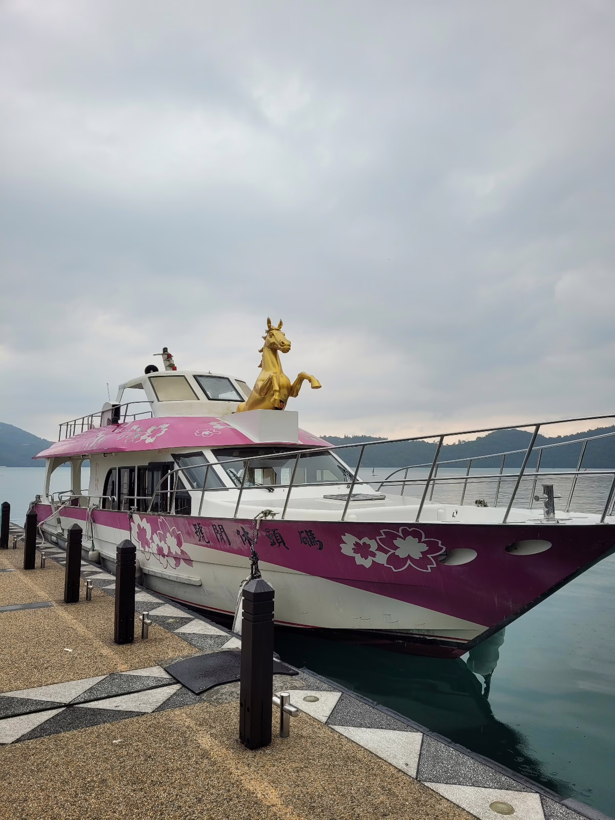 Die schönste Art, den See zu erleben, ist per Boot. Vom Shuishe Pier geht es los – nach kurzem Suchen finde ich auch den richtigen Anleger und verstehe das System. Welches Boot ist meines? Natürlich, das Knallpinke mit dem Einhorn obendrauf. Asiatischer Kitsch at its best.