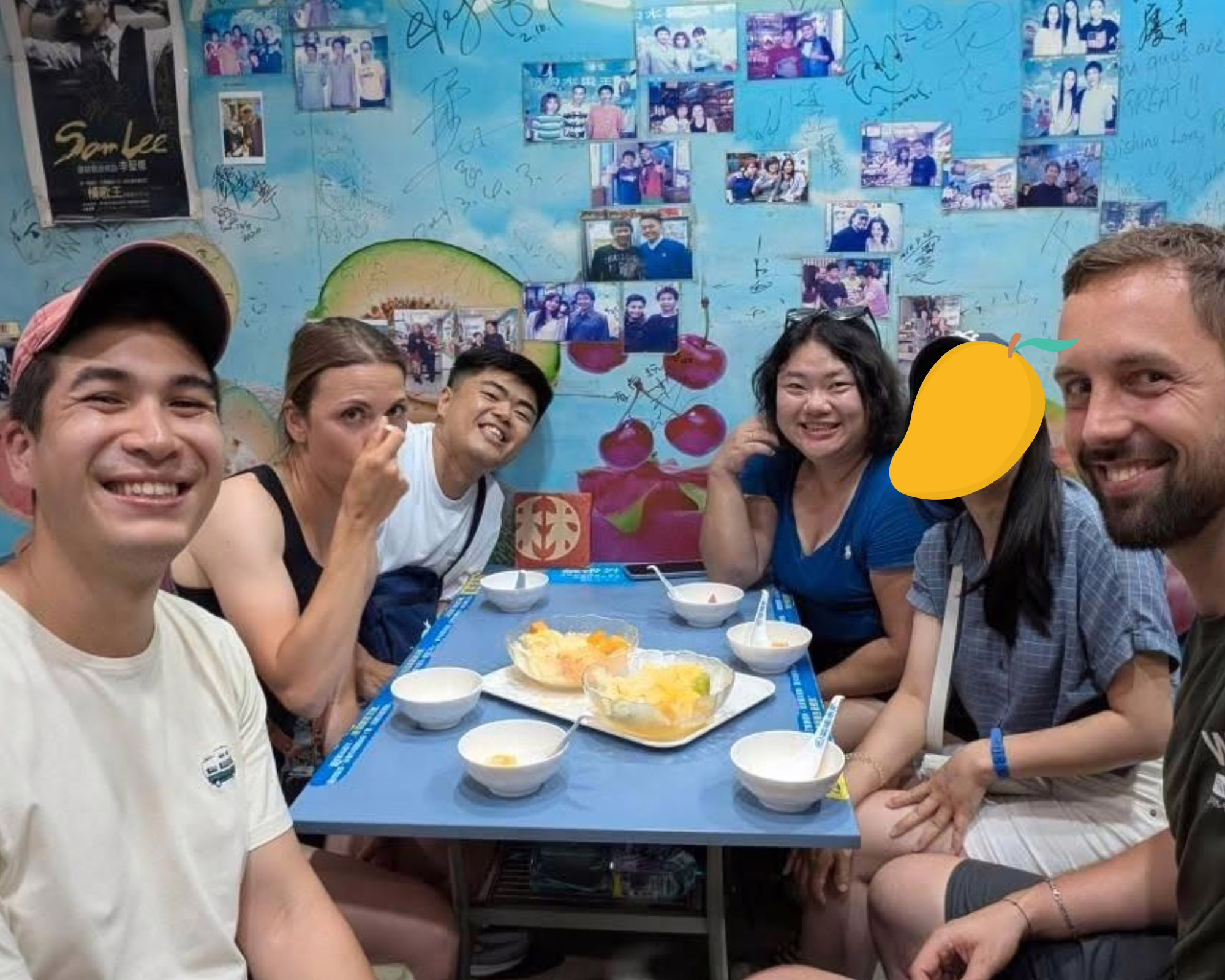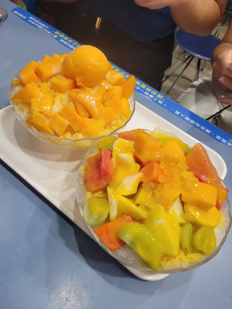 Der Laden ist beliebt und nachts herrscht Hochkonjunktur. Wir müssen Schlange stehen und subtilen Druck auf zu lange sitzende Gäste ausüben, indem wir uns demonstrativ neben ihre Tische stellen – die taiwanische-höfliche Art, sich Platz in vollen Restaurants zu verschaffen. Zur Belohnung fliegen wenig später zwei gigantische Kübel shaved ice auf unseren Tisch: einer mit Mango und einer mit Obstsalat.