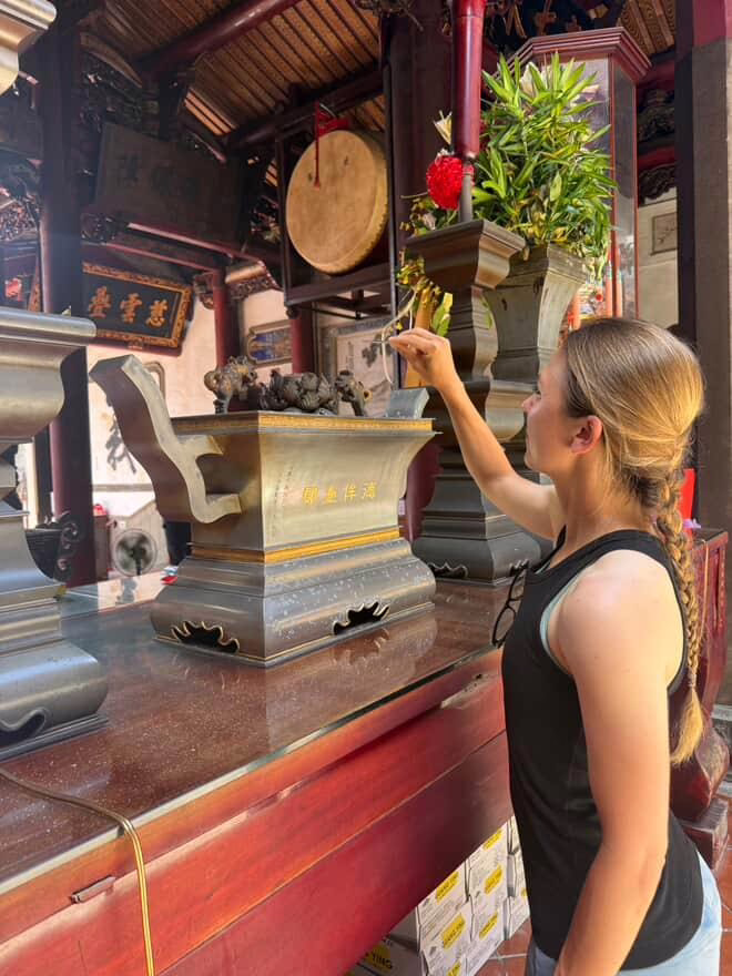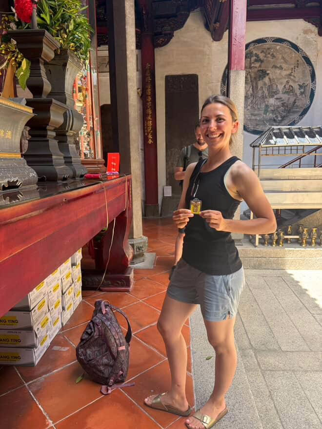 Wir quetschen uns durch die narrow door alley und verweilen am dahinterliegenden Tempel, der nach Einbruch der Dunkelheit noch mystischer wirkt. Ich komme an dieselben Orte, die ich mit der Tour von Emilys Kollegen am Vortag schon besucht habe. Doch durch die Menschen, mit denen ich unterwegs bin, ist heute alles tiefer, bedeutungsvoller und magischer.