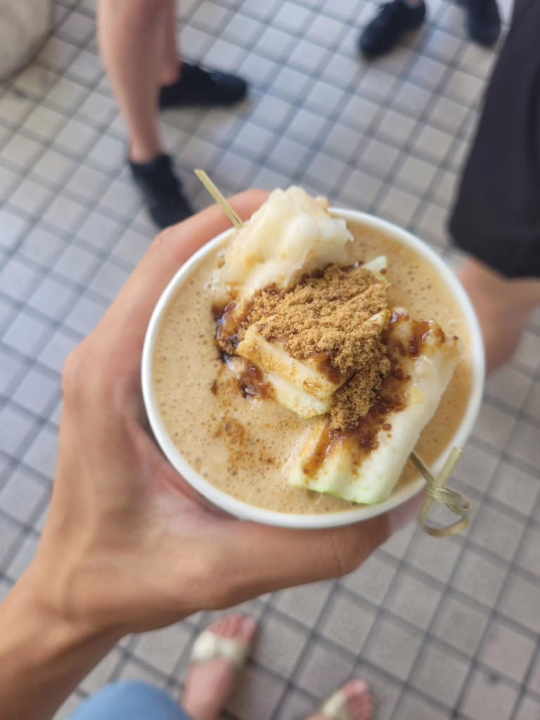 Nach so viel spiritueller Kost brauchen wir eine Stärkung für unsere physische Hülle. In einem kleinen, traditionellen Laden verkosten wir Tainans beliebten melon gourd drink. Beni nimmt sich die süße Grundzutat dafür direkt mit nach Hause. Wir schätzen gemeinsam das Potenzial ab, einen Laden in Deutschland zu eröffnen, der dieses Getränk anbietet. Eine Geschäftsidee nimmt Form an.