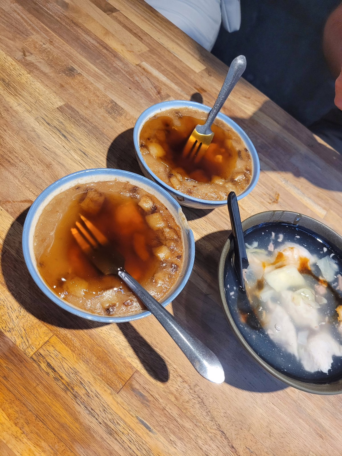 Wir starten hier mit einem merkwürdig aussehenden aber köstlichen Reispudding, der mit Shrimps und Schweinefleisch verfeinert ist. Dazu gibt es eine süßlichen Suppe mit zarten Fischbällchen.