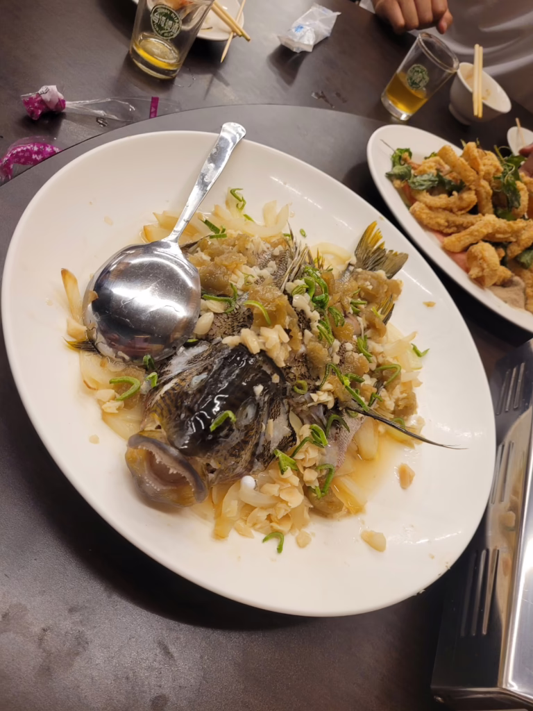 Ein nicht enden wollender Strom an Speisen findet seinen weg auf die Drehscheibe: Gegarter Bambus mit Mayo, gegrillter Oktopus, Venusmuscheln, Schnecken, ein ganzer Fisch, gebratener Knoblauchreis mit Garnelen, Wasserspinat, frittierte Kalamari, Wurst, Schweinefleisch und noch mehr Fisch. Ich traue meinen Augen nicht, als ich die Rechnung sehe: 700 TWD – keine 20 Euro pro Person. Könnt ihr euch das vorstellen?
