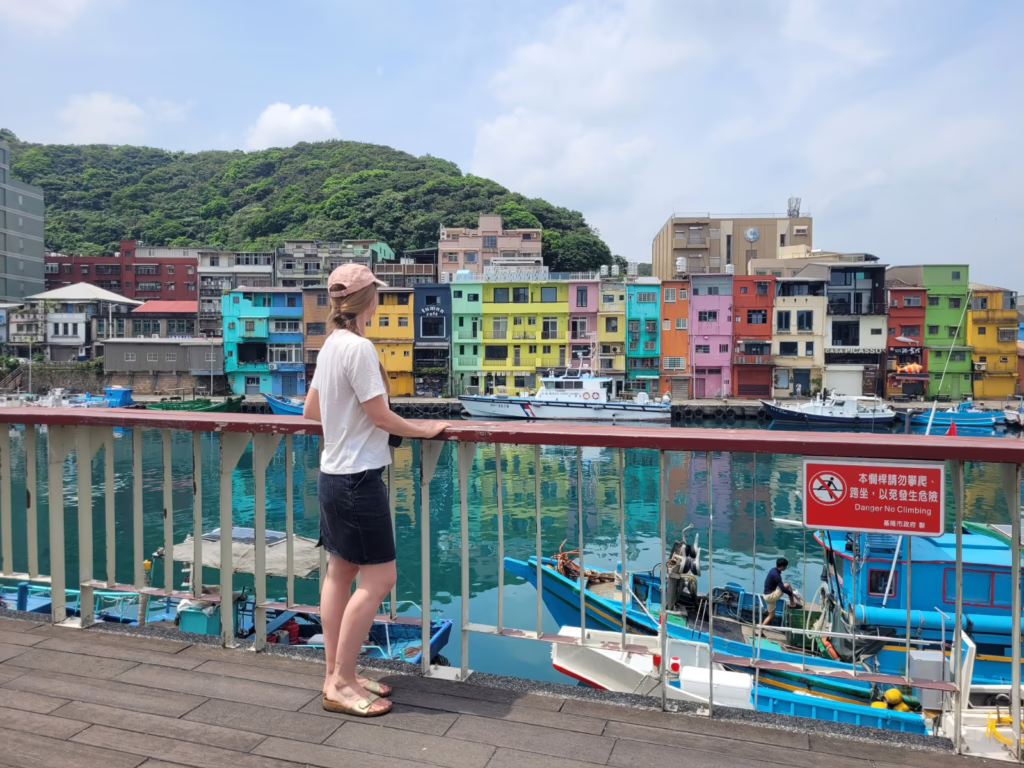Ich gebe zu – ja, ich bin für dieses eine Foto hier. Zwischen Möwengeschrei und Hafenwind verpflichte ich beistehende Tourist:innen, mich abzulichten. Da das hier Taiwan ist, sind auch Hotspots wie dieser zum Glück nur moderat besucht.