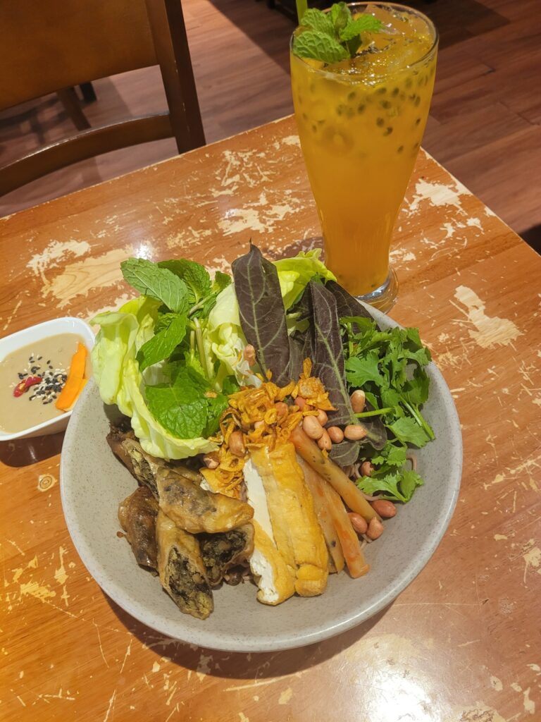 Toller Veggie-Lunch-Spot, den viele gut situierte Vietnames:innen nutzen, um mit Geschäftspartner:innen Mittag zu essen. Entsprechend etwas höhere Preise, aber immer noch sehr fair. Für 5,90 habe ich Dumplings mit Kürbisfüllung, vegetarische Reisnudeln mit allerlei Tofu und frischen Kräutern und einen Maracuja-Saft genossen. Der Service ist außergewöhnlich freundlich und man sitzt wunderbar ruhig und kühl.