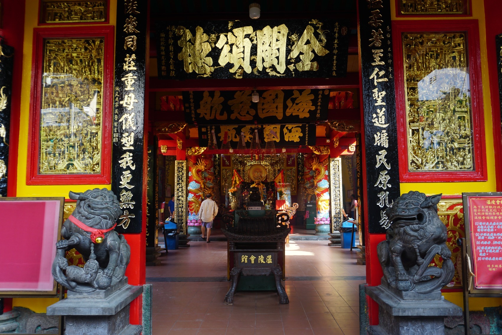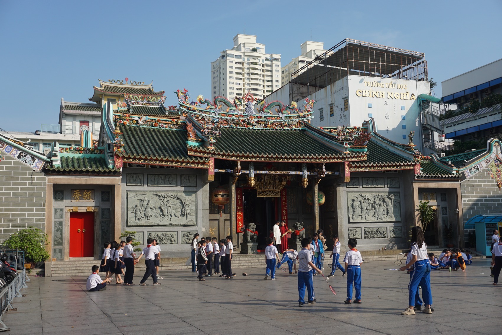 Ein guter erster Landungspunkt in Cholon ist die Tue Thanh Assembly Hall, ein 1760 erbauter Tempel zu Ehren der Seefahrer-Göttin Mazu. Von dort aus könnt ihr bequem (!) zur Nghia An Versammlungshalle (auch genannt Ong-Pagode) weiterlaufen. Dort wird der Gott Quan Cong verehrt, der für die Loyalität der im Ausland lebenden Chines:innen gegenüber ihrer Heimat steht. Der Name „Nghia An“steht für das Konzept der Erinnerung an die eigenen Wurzeln. Zur Zeit meines Besuchs quillt der Platz vor dem Eingang über mit tobenden Schulkindern, die wohl ihre Pause dort verbringen. Ein einzigartiges Stück Alltag, das ich hier miterleben darf.