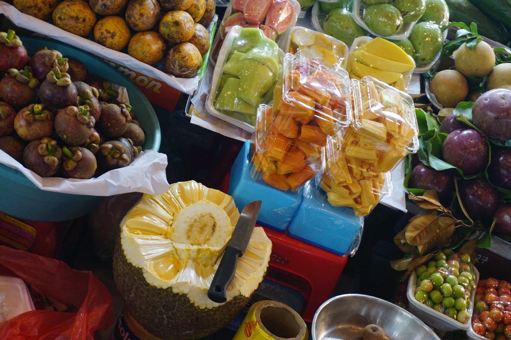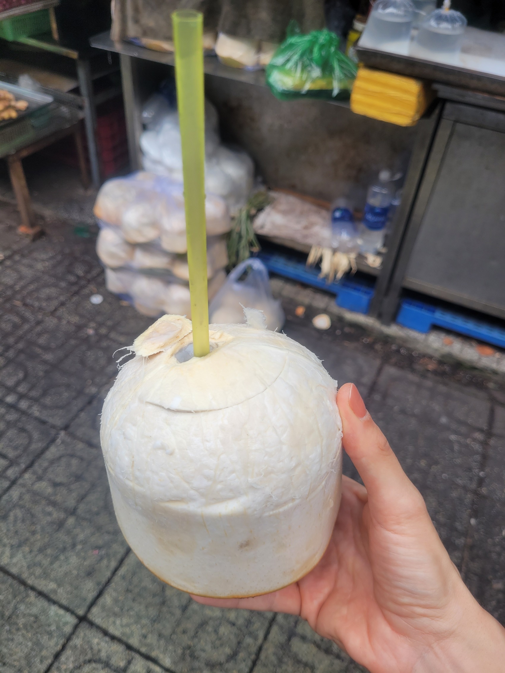 Wir bestaunen Dekoration für die in zwei Wochen anstehenden Tết-Feierlichkeiten, Kaffeebohnen, Tee und Gewürze, Früchte und lebendige Fische, Krabben und Muscheln. Und können der Versuchung einer frisch aufgeschlagenen Kokosnuss nicht widerstehen. Das Wasser kühlt und erfrischt herrlich in der Hitze des anbrechenden Tages. Und die Preise sind hier definitiv realistischer als bei den Kokosnüssen, die am Straßenrand in der Nähe von Sehenswürdigkeiten angeboten werden.
